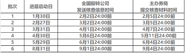 2026年,全国股转公司共拟实施6次创新层进层实施工作,分别以1月30日、2月27日、3月31日、4月30日、5月29日和8月31日为进层启动日,具体时间安排如下: