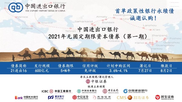 2021年7月27日,民生证券做为联席主承销商的中国进出口银行600亿规模的2021年无固定期限资本债券(第一期)(债券简称:21进出16)在银行间债券市场成功发行。